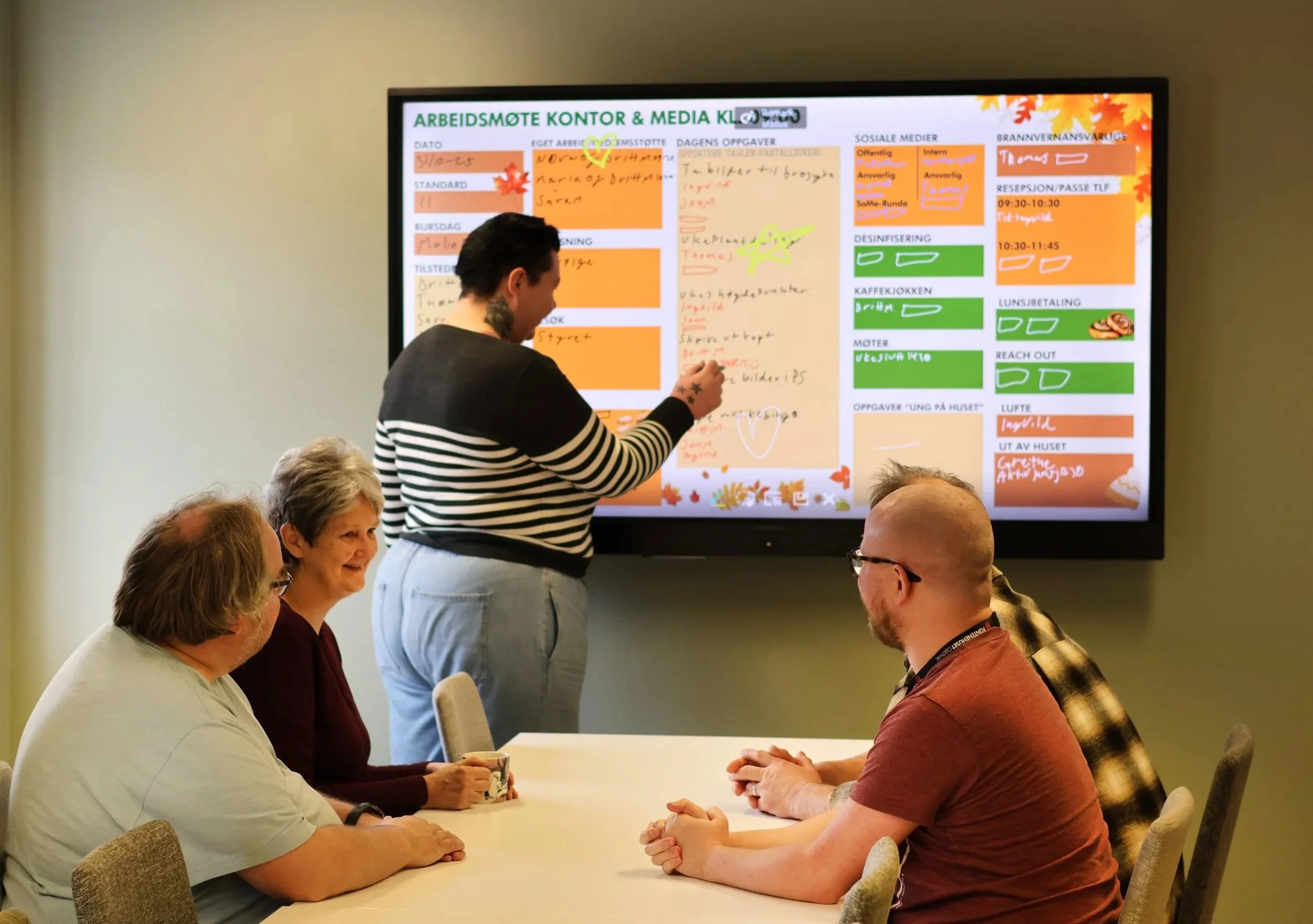 Vi har arbeidsmøter kl. 09:00 og 13:00. På arbeidsmøtene fordeler vi arbeidsoppgavene som skal gjøres og de som er tilstede velger hvilke oppgaver de har lyst å bidra med. Det kreves ingen forkunnskaper for å kunne delta i de ulike oppgavene. Vi løser arbeidsoppgavene i fellesskap, støtter og hjelper hverandre. Både medlemmer og medarbeidere sørger for at medlemmer som kommer til arbeidsmøtene eller etter blir inkludert i arbeidsfellesskapet.